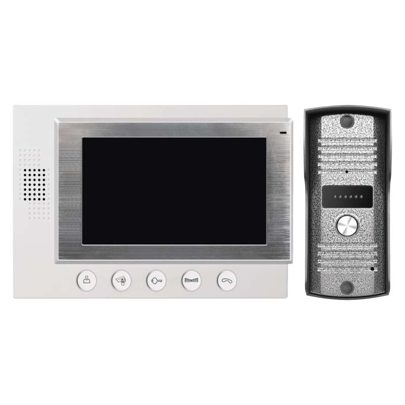 Jednoduchá sada videovrátnika. Obraz je zobrazovaný na veľký 7" farebný LCD. Prístroj je napájaný pomocou priloženého adaptéra na 12 V. Zariadenie umožňuje obsluhu dverného zámku a pojazdu brány.