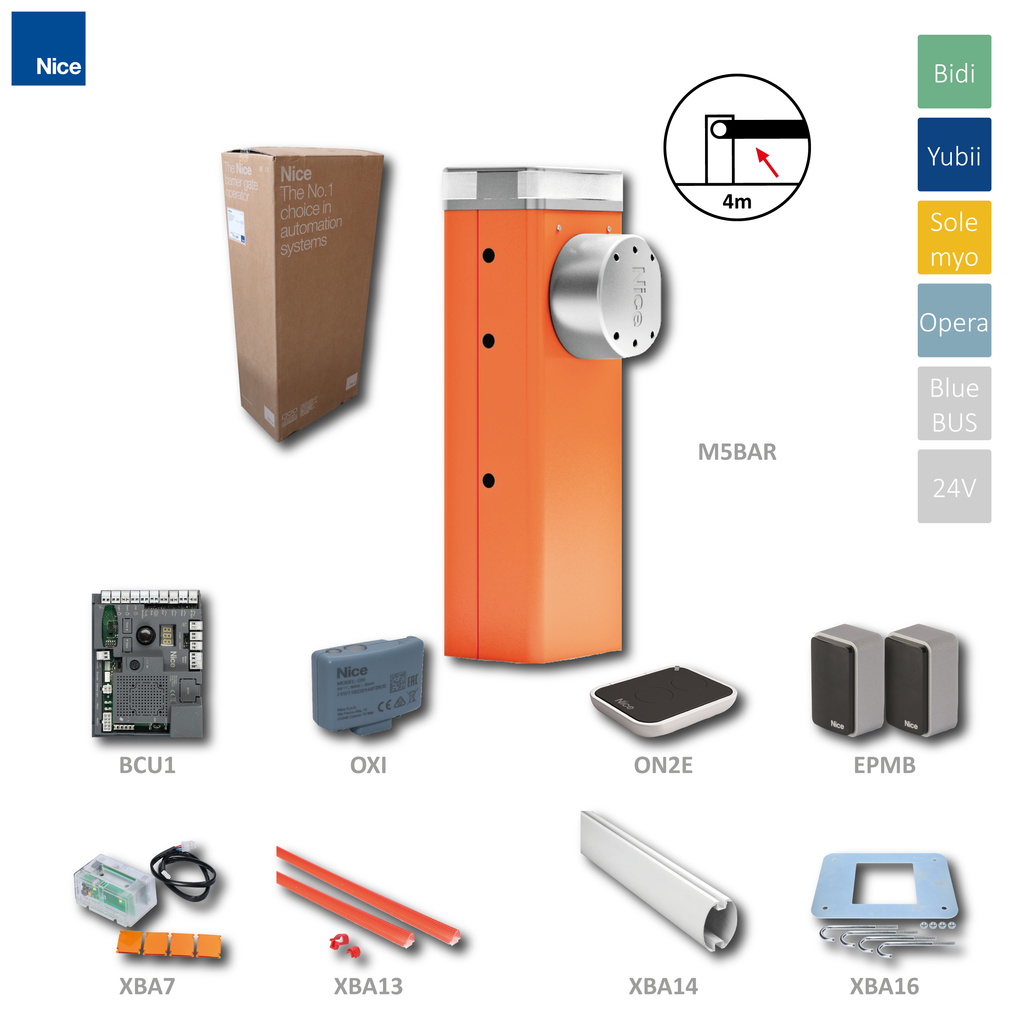 NICE M-BAR KIT automatická závora M5BAR do 4m (24V, 120W, 200Nm) s elektronikou XBA3, 1x XBA14, 1x XBA13, 1x OXIBD, 1x ON2E, 1pár EPMB, 1x XBA7,