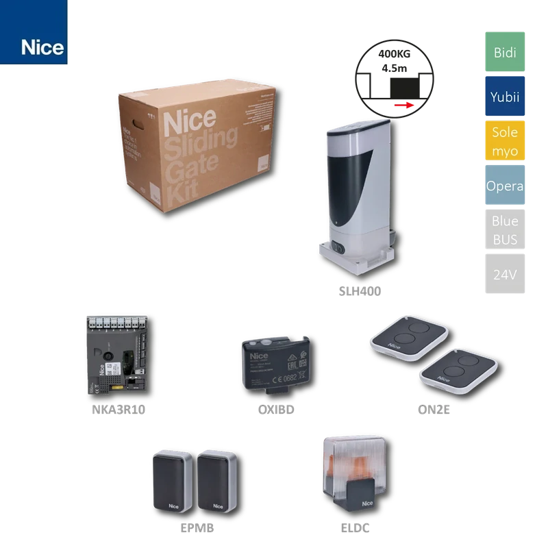 NICE sada pohonu SLIGHT pre posuvnú bránu do 400kg s LED osvetlením, motor 24V,250W,6Nm, a prislušenstva 2x ON2E, 1x EPMB, 1x OXIBD, 1x ELDC