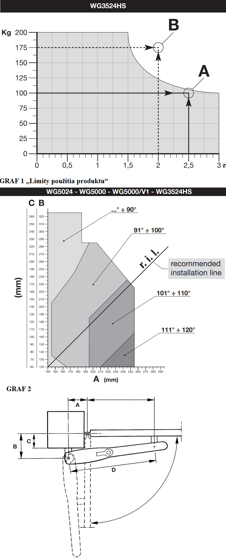 Pred inštaláciou výrobku skontrolujte, či je brána správnej veľkosti a hmotnosti a spadá do limitov uvedených v grafe. Tvar, výška brány a poveternostné podmienky môžu hodnoty výrazne znížiť.