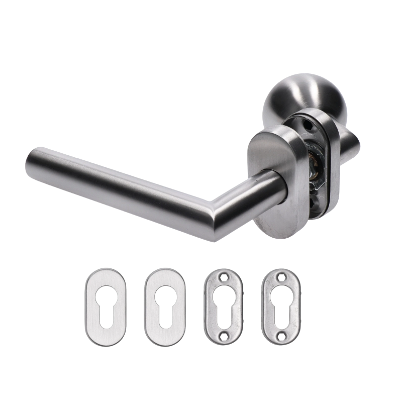 - EB1-OKG-L kľučka (ľavá) + guľa (otočná), vyhnutá vrátane dolnej rozety, balenie: 1ks kľučka (ľavá), 1ks guľa, 2ks dolná oválna rozeta,brúsená nerez AISI304