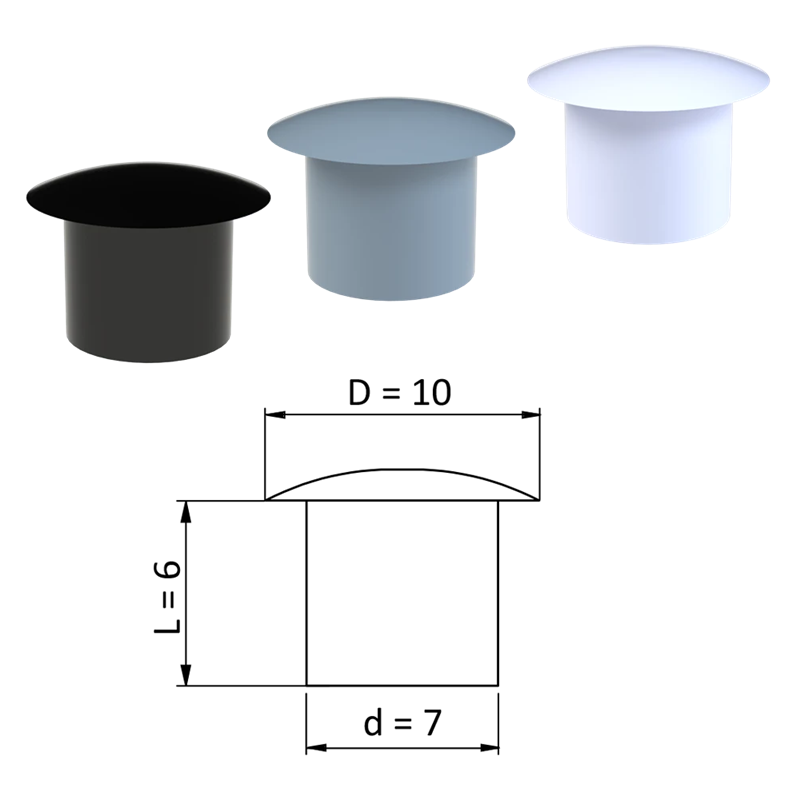 ZDO10x7 - Vnútorná krytka guľatá ø 10 mm, otvor ø 7 mm, plast - Biela, Čierna, Šedá