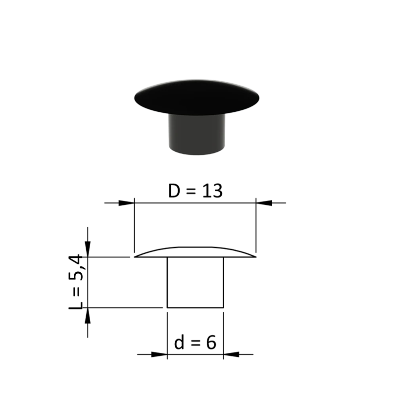 ZDO13x6BLACK Vnútorná krytka guľatá ø 13 mm, otvor ø 6 mm, čierna, plastSkladom0,10 €/ ks0,08 € bez DPH